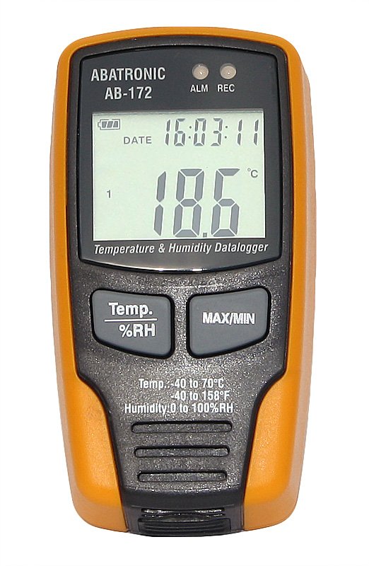 Przenośny rejestrator temperatury i wilgotności AB-172 z wyświetlaniem bieżących wartości na wyświetlaczu LCD. Posiada wbudowany czujnik temperatury i wilgotności. Znajduje szerokie zastosowanie wszędzie tam gdzie niezbędna jest archiwizacja temperatury. Szczególnie w przemyśle spożywczym, rolniczym, chłodniczym, farmaceutycznym i laboratoryjnym. Stosowany również w transporcie chłodniczym. Podgląd max i minimalnej temperatury i wilgotności zmierzonej, sygnalizacja optyczna przekroczonych progów alarmowych.