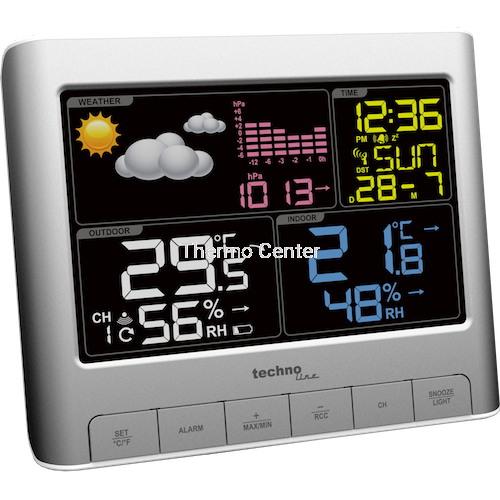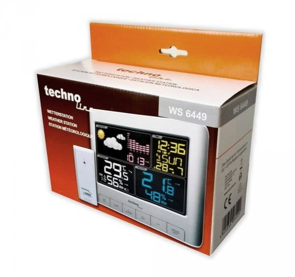 Stacja pogodowa bezprzewodowa Technoline WS 6449 kolorowa z czujnikiem zewnętrznym. Urządzenie umożliwia pomiar ciśnienia atmosferycznego, a także temperatury i wilgotności powietrza w dwóch punktach, tj. w miejscu usytuowania konsoli odbiorczej (domowej) i w miejscach zlokalizowania czujnika zewnętrznego. Czujnik komunikuje się z konsolą odbiorczą bezprzewodowo (433 MHz) na odległość do 100 m w otwartej przestrzeni. Konsola może odbierać sygnał i wyświetlać dane z maksymalnie 3 bezprzewodowych czujników temperatury i wilgotności (TX 960) - zestaw zawiera 1 czujnik. Stacja pogodowa, m.in. rejestruje i wyświetla wartości minimalne i maksymalne, jak również posiada wbudowany zegar sterowany radiowo DCF-77 z budzikiem i funkcją drzemki. Do najważniejszych zalet urządzenia należy zaliczyć: