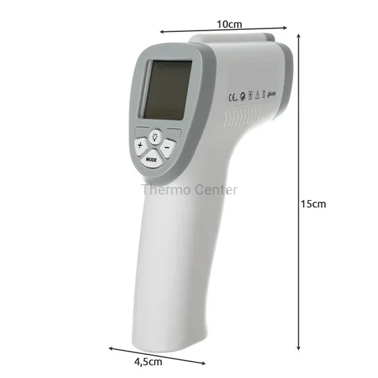 - BEZDOTYKOWY - termometr bezdotykowy do pomiaru temperatury ciała oraz dowolnych powierzchni. Do zastosowań zarówno w warunkach domowych, jak i w miejscach publicznych. Wygodny, "pistoletowy" kształt sprawdza się przy przesiewowej kontroli temperatury, np. podczas pandemii. Aby zmierzyć temperaturę wystarczy ustawić termometr w kierunku czoła w odległości 3-5 cm i nacisnąć przycisk na rękojeści.