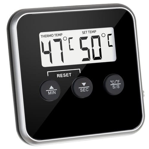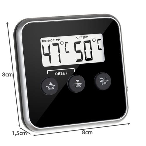 - PANEL STERUJĄCY + TIMER – termometr posiada 3 przyciski odpowiadające za sterowanie. Przydatna jest w nim funkcja minutnika z sygnałem dźwiękowym. Alarm włączy się gdy minie czas wcześniej określony przez Ciebie.